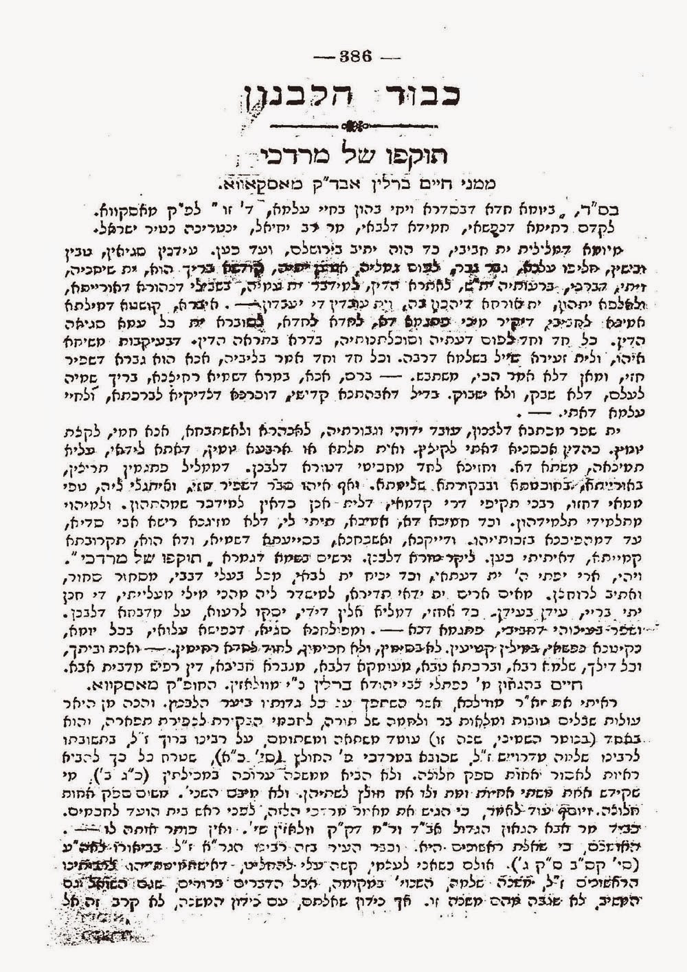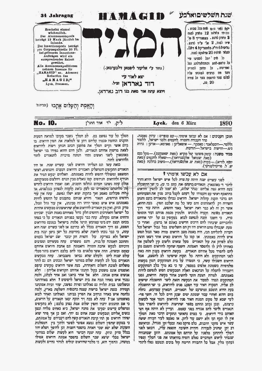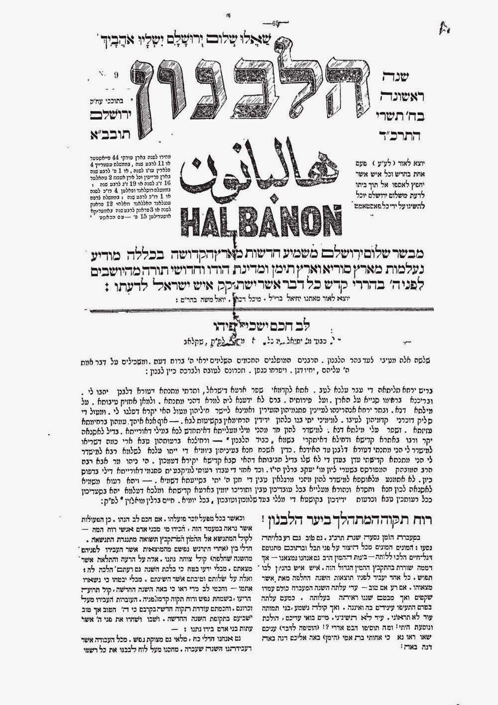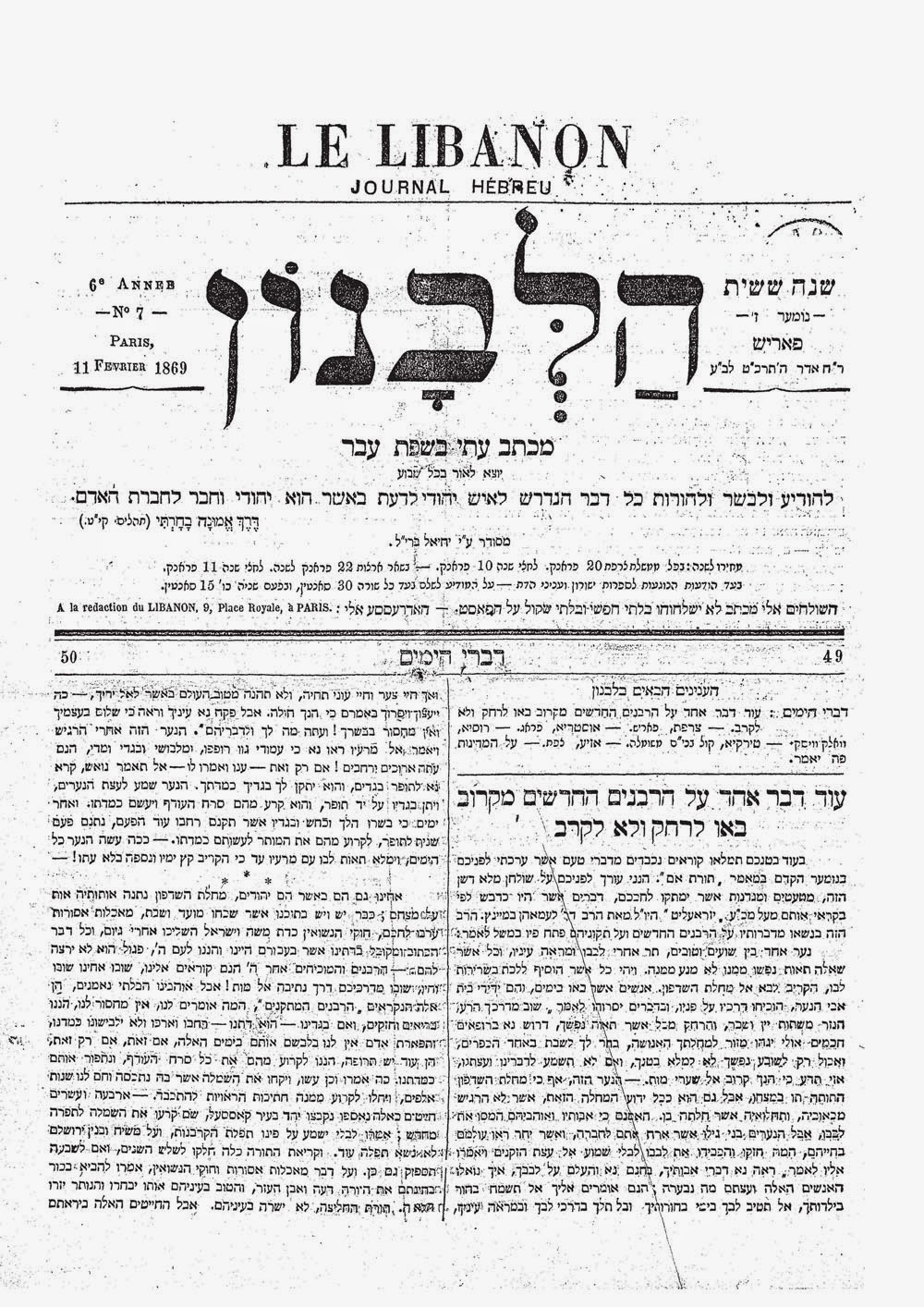 בשבת אתמול בסעודת ש”ק [=שבת קודש] בחברת מרעים כבדים, אהובים וידידים, רבנים מצוינים, וגבירים אדירים, עלה לפנינו עלה מכה”ע [=מכתב עת] המליץ, מיום ג’ העבר, נו’ 139, ושם נאמר…