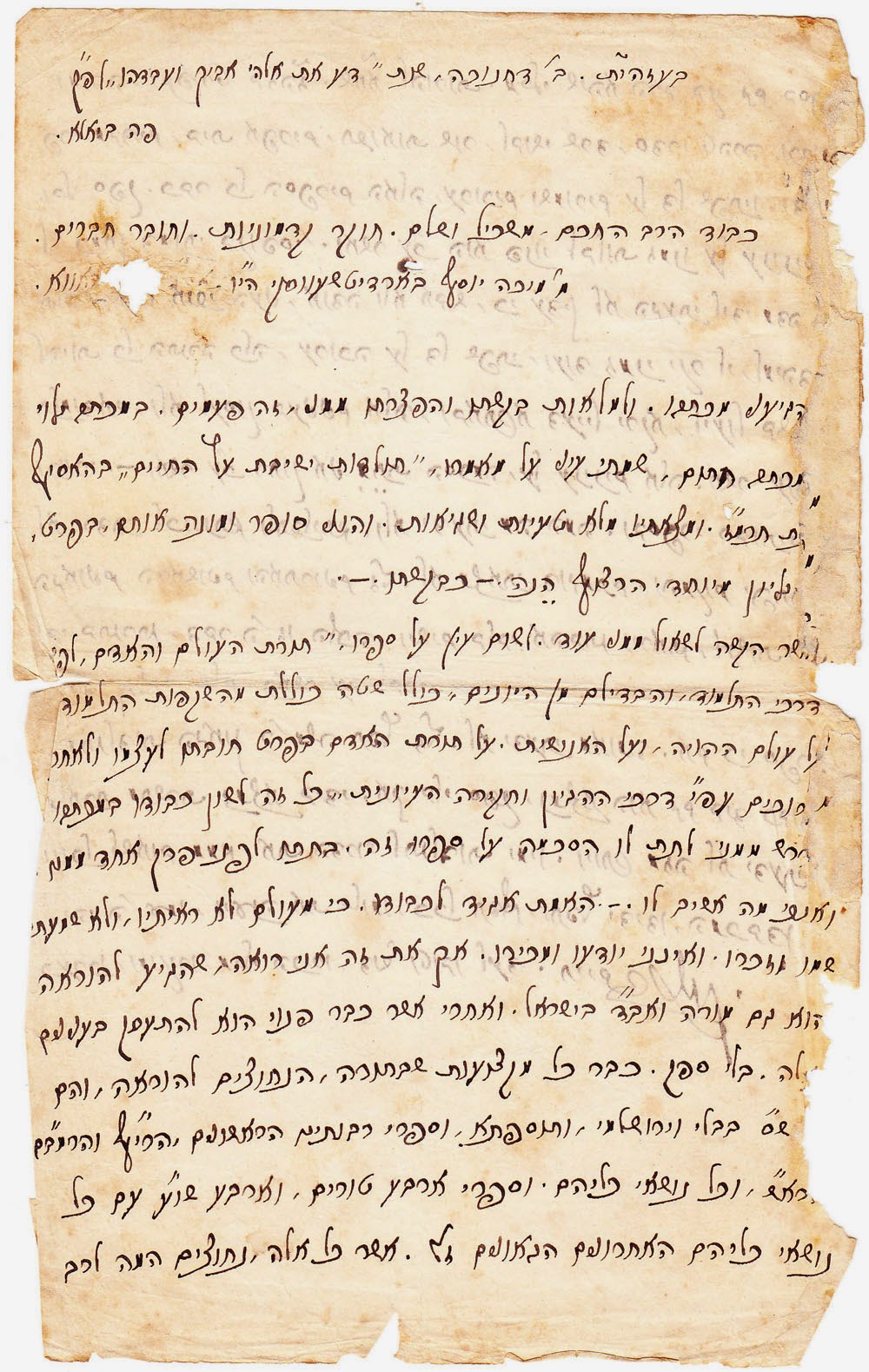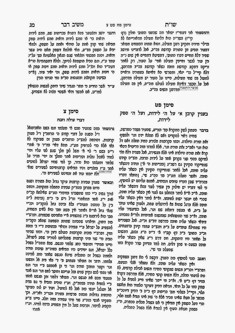 ואשר הקשה לשאול ממני עוד. לשום עין על ספרו, “תורת העולם והאדם, לפי דרכי התלמוד, והבדילם מן היונים, כולל שטה כוללת מהשקפות התלמוד על עולם ההויה, ועל האנושות. על תורת האדם בפרט חובתו לעצמו ולאחר [ע]רוכים עפ”י דרכי ההגיון וחקירה העיונית”, כל זה לשון כבודו במכתבו [ש]דרש ממני לתת לו הסכמה על ספרו זה. בתתו לפני מפרק אחד ממנו. ואנכי מה אשיב לו. – האמת אגיד לכבודו. כי מעולם לא ראיתיו, ולא שמתי שמו וזכרו. ואינני יודעו ומכירו. אך את זה אני רואה שהגיע להוראה [ו]הוא גם מורה ואב”ד בישראל. ואחרי אשר כבר פנוי הוא להתעסק בענינים [א]לה. בלי ספק. כבר כל מקצועות שבתורה, הנחוצים להוראה, והם ש”ס בבלי וירושלמי, ותוספתא, וספרי רבותינו הראשונים, הרי”ף והרמב”ם [וה]רא”ש, וכל נושאי כליהם. וספרי ארבע טורים, וארבע שו”ע עם כל נושאי כליהם האחרונים הגאונים ז”ל. אשר כל אלה, נחוצים המה לרב ומורה, ובפרט בזה”ז. שא”א להורות. מבלי שיהא הרב בקי גם בספר פרי מגדים, בית אפרים, תבואות שור, לבושי שרד, סדרי טהרה, וכדו[מה.] ובלי ספק. כבר כל הספרים האלה, ערוכים ושמורים על דל שפתיו וד[מי] לי’ כמאן דמנחי בקופסי’. ואשר ע”כ הוא פנוי לבלות זמנו על ענינים אלה – [אבל] אנכי העני, אודה ולא אבוש, כי עדין לא הגעתי לידי מדה זו להיות כל התורה כלה, ערוכה על דל שפתי, ועוד זמני יקר לי, למיהדר תלמודא, ולא לעסוק בענינים אלה, ובאתרא דעייל ירקא, ליעול בשרא וכוורי.-. ואשר ע”כ רחוק אני מִתֵת הסכמה, על ענינים אלה. אשר עוד לא ירדתי לכוונתם ולתכליתם. ולא ידעתי מה המה. ובספרי רבותינו הגאונים הראשונים והאחרונים ז”ל. לא מצאתי דוגמתם. והמקום יפתח לבי בתורתו, דבר ה’ זו הלכה. וישים בלבי אהבתו ויראתו, לעשות [רצונו] ולעבדו בלבב שלם. כאשר עם לבבי.-.