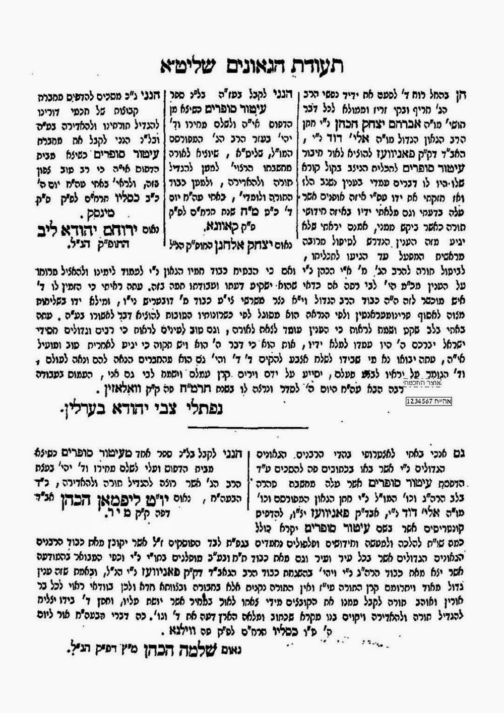 הגיעני מווילנא על ש”ק שני עלי לבנון משנת ששית. וקראתי לשבת עונג מפרשת העלים ומדברי מע”כ שי’ המפקידים חן ודעת שכל טוב. ובהגיעי לנו 2 בבשורת סי’ הזכרון להריטב”א ז”ל נרגשתי במה שהעיר חכם א’ מעצמו וגם בשם האברבנאל ז”ל השגה…