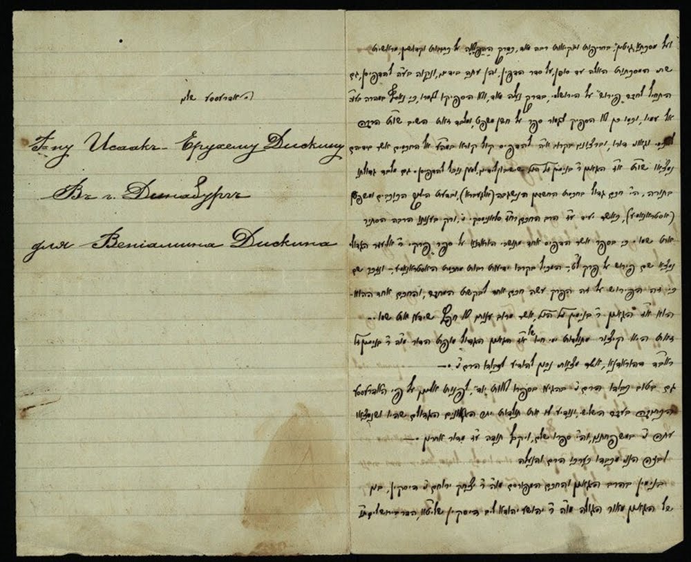 דינאבערג יום ה’ י”א תשרי שנת תרמ”חכבוד הרב החכם המפורסם, פאר עמוכש”ת מו”ה ר’ שמואל יוסף פין נרו יאיר ויופיע!אחדשה”ט, הנה אודיע לכבודו הרם כי את כל ספריו קראתי בשמחת לב, וביותר את ספרו האחרון כנסת ישראל[64], אשר זה הֵחֵל לצאת לאור עולם, כי ספרו זה המכיל בקרבו את תולדות חכמי עמנו מימי הגאונים ועד עתה הוא אוצר יקר בספרות ישראל.ומאשר כי בספרו זה באות ב’ יבוא גם זכרון אַבִי אָבִי זקני הוא הרב הגאון הגדול מופת הדור מו”ה ר’ בנימין דיסקין זצ”ל ראב”ד בהוראדנא[65], לכן הנני להודיע לכבודו הרם את קיצור תולדות ימי חייו ואת מספר הכת”י אשר השאיר אחריו למען יחקק זאת לדור אחרון.הרב הגאון ר’ בנימין דיסקין ז”ל הנ”ל, הנודע בשמו “ר’ בנימין ראב”ד מהוראדנא”, הי’ בראשונה ראב”ד בהוראדנא, – מפני החרם שהי’ שם, לא הי’ יכול להיקרא בשם רב מהוראדנא[66], – ואח”כ הי’ רב בעיר לאמזא, ונאסף בשנת מ”ו שנה לימי חייו, והרביץ תורה רבה בישראל, ומגדולי תלמידיו היו: הרב הגאון ר’ יצחק אלחנן שליט”א רב דעיר קאוונא, והרב הגאון ר’ שמואל אביגדור ז”ל רב דעיר קארלין[67], בעל המחבר תוספאה, ועוד הרבה גאוני וגדולי הדור ההוא; והניח אחריו[68] שני כתבי-יד על מסכתא “יבמות” ועל מסכתא “גיטין”, בחריפות ובקיאות רבה מאד, כדרך הַהַפלָאָה על כתובות וקדושין, מראשית שתי המסכתות האלה עד סופן, על סדר הדפין, והן עתה בידינו, ונקוה בע”ה להדפיסן, גם התחיל לחבר “פירוש” על הירושלמי, בדרך נעלה מאד, ולא הספיקו לגמרו, כי נאסף במהרה בעו”ה אל עמיו, וכמו כן לא הספיק לגמור ספר על חשן משפט[69], ומלבד זאת השיב שו”ת הרבה ל…[70] וגאוני דורו, וברצוננו בקרוב אי”ה להדפיס קול קורא במה”ע אל החכמים אשר בידיהם נמצאו שו”ת א”ז הגאון ר’ בנימין ז”ל הנ”ל שישיבון לידינו, למען נוכל להדפיסן.[71] גם מלבד גדולתו בתורה, הי’ חכם גדול בחכמת החשבון הנשגבה (אלגעברא), ובדעת הילוך הכוכבים ומשפטן (אסטראנאמיע), כאשר יעיד ע”ז הרב החכם רח”ז סלאנימסקי נ”י, ורק בענוותו הרבה הסתיר את שמו. כי בספר אשר הדפיס אחד מתושבי הוראדנא על ספר “פרקי ר’ אליעזר הגדול”[72] נמצא שם פירוש על פרק ל”ט, – המכיל בקרבו ידיעות רבות מחכמת האסטראנאמיע, – ונזכר שם כי זה הפירוש על זה הפרק עשה חכם אחד לבקשת המחבר, והחכם אחד ההוא – הוא א”ז הגאון ר’ בנימין ז”ל הנ”ל, אשר מרוב ענוותו לא חפץ שידעו את שמו[73].זאת היא קיצור מתולדות ימי חייו של א”ז הגאון הגדול מופת הדור מו”ה ר’ בנימין ז”ל ראב”ד דהוראדנא, אשר מצאתי נכון להודיע לכבודו הרם נ”י.גם בטוב כבודו הרם נ”י בהגיעו בספרו לאות “יו”ד”, לפנותו אלינו על פי האדרעססע הכתובה בעבר השלישי, ונודיע לו את תולדות יתר הגאונים הגדולים שהיו ושנמצאו עתה ..[74] במשפחתנו, והי’ ספרו שלם, ויקבל תודה ע”ז מדור אחרון.