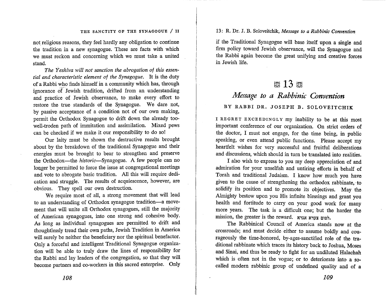 Permit me to say the following. One of the fundamentals of my faith is that the Halachah is an all-inclusive discipline and system of thought capable of meeting any challenge of modern times and of confronting the most perplexing problems which a technically progressive and scientifically minded society may periodically pose. This optimistic formula, however, cannot always be successfully applied because of the limited knowledge and the imperfect intellectual capability of the human being. I for one, am not always able to behold the Halachic truth and to see the light under all circumstances. Many a time I grope in the dark, pondering, examining and re-examining an intricate Halachic problem – and find myself unable to arrive at a clear decision. Even the Talmud has not solved all problems and has not answered all questions. The Teiku is a very prominent and characteristic feature of Torah She-B’al Peh. We members of the Halachah Commission are not partners in a contracting firm whose task it is to provide every member of the Rabbinical Council of America with a clear-cut answer to his problems. Quite often the solution eludes us. We are beset by grave doubts. We face many alternatives not knowing which to choose since each is supported by sound logical reasoning. We cannot be guided in our decisions by emotional factors or pragmatic arbitrariness and hence we are impelled to employ in such situations the principle of “B’divrai Torah Haloch Achar Hamachmir” which seems to inconvenience some of our members.