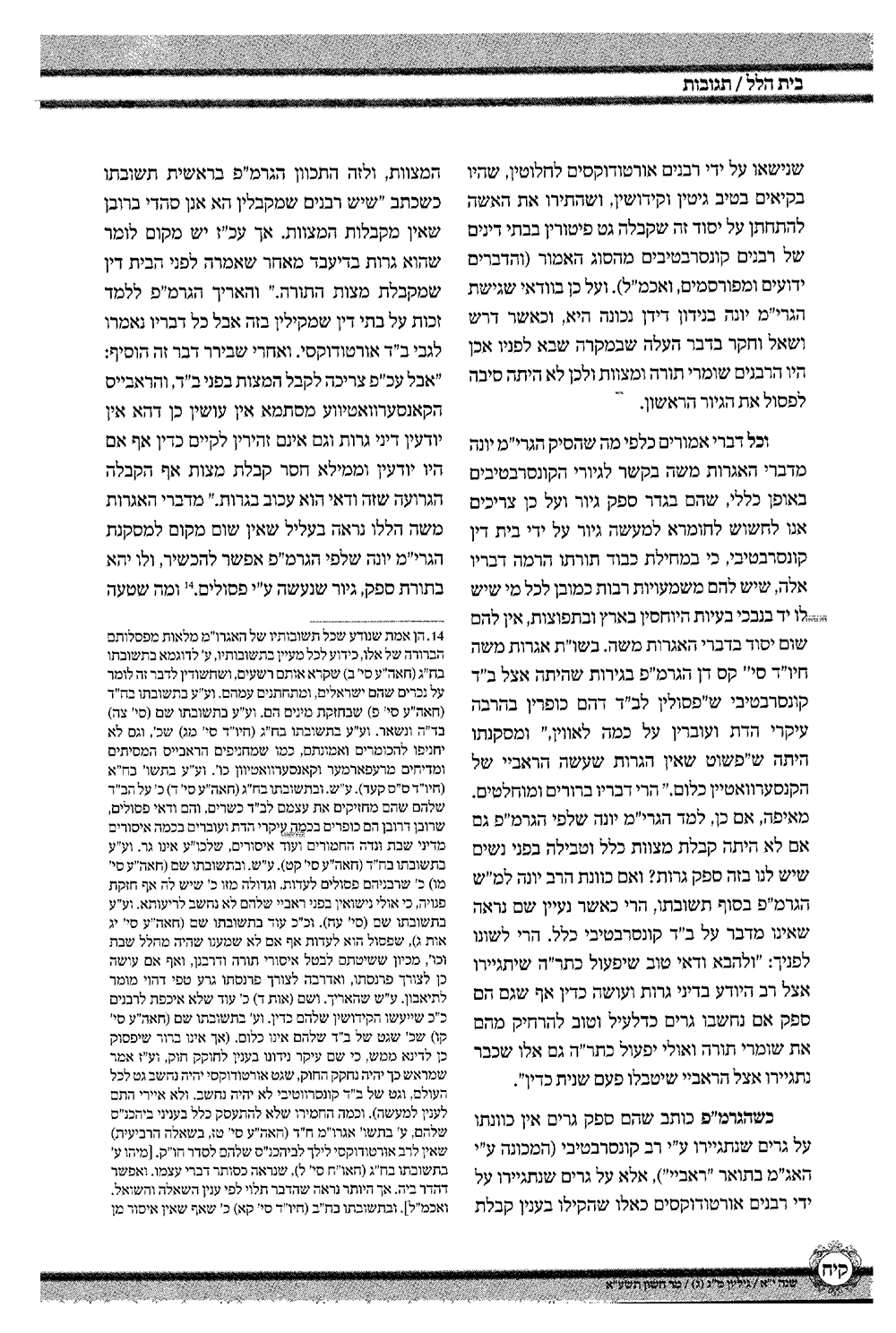 Apropos of the above-mentioned responsum on conversion by R. Ovadiah Yosef, in Beit Hillel, Adar 5770, R. Yisrael Meir Yonah deals with a conversion done by a Conservative beit din. He rules that in this particular case the conversion is valid. This ruling was affirmed by R. Ovadiah.In his responsum, R. Yonah states that R. Moses Feinstein regarded Conservative conversions as doubtful conversions rather than completely invalid, and brought two supposed proofs for this. I responded to R. Yonah in Beit Hillel 43 (Heshvan 5770), and you can see my letter here.[1]