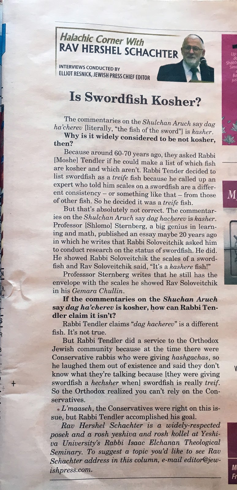 5. In addition to being the posek of the OU, R. Hershel Schachter is also the one Kashrut Vaads all over America turn to for halakhic decisions. That being the case, now that R. Schachter has publicly declared that swordfish is kosher[18] (his private opinion has been known for a long time), how come no Vaads in the United States will certify it as kosher? (In the first half of the twentieth century Orthodox Jews in the U.S. ate swordfish. See my post here.) Does this mean that in the U.S. the practice of not eating swordfish is for all intents and purposes now regarded as binding, and cannot be overturned even by a great posek?