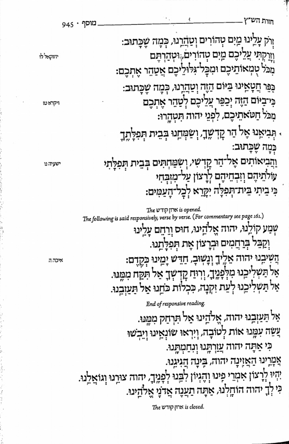 As you can see, אל תעזבנו has now been pushed to the next paragraph. We are also instructed that both אמרינו and יהיו לרצון are to be said quietly. Yet this doesn’t seem to make any sense, as those who are reciting Shema Kolenu responsively will not be saying these verses quietly. And again, I ask, is there any real tradition that these verses are to be said quietly, or is this something made up by people in an attempt to keep the traditional text of the Machzor while dealing with the fact that these verses are not part of the responsive reading? Unfortunately, when updating the Machzor, ArtScroll did not correct the instructions which still refer to the “first six verses” as being recited responsively, when instead it should say the “following four verses”.