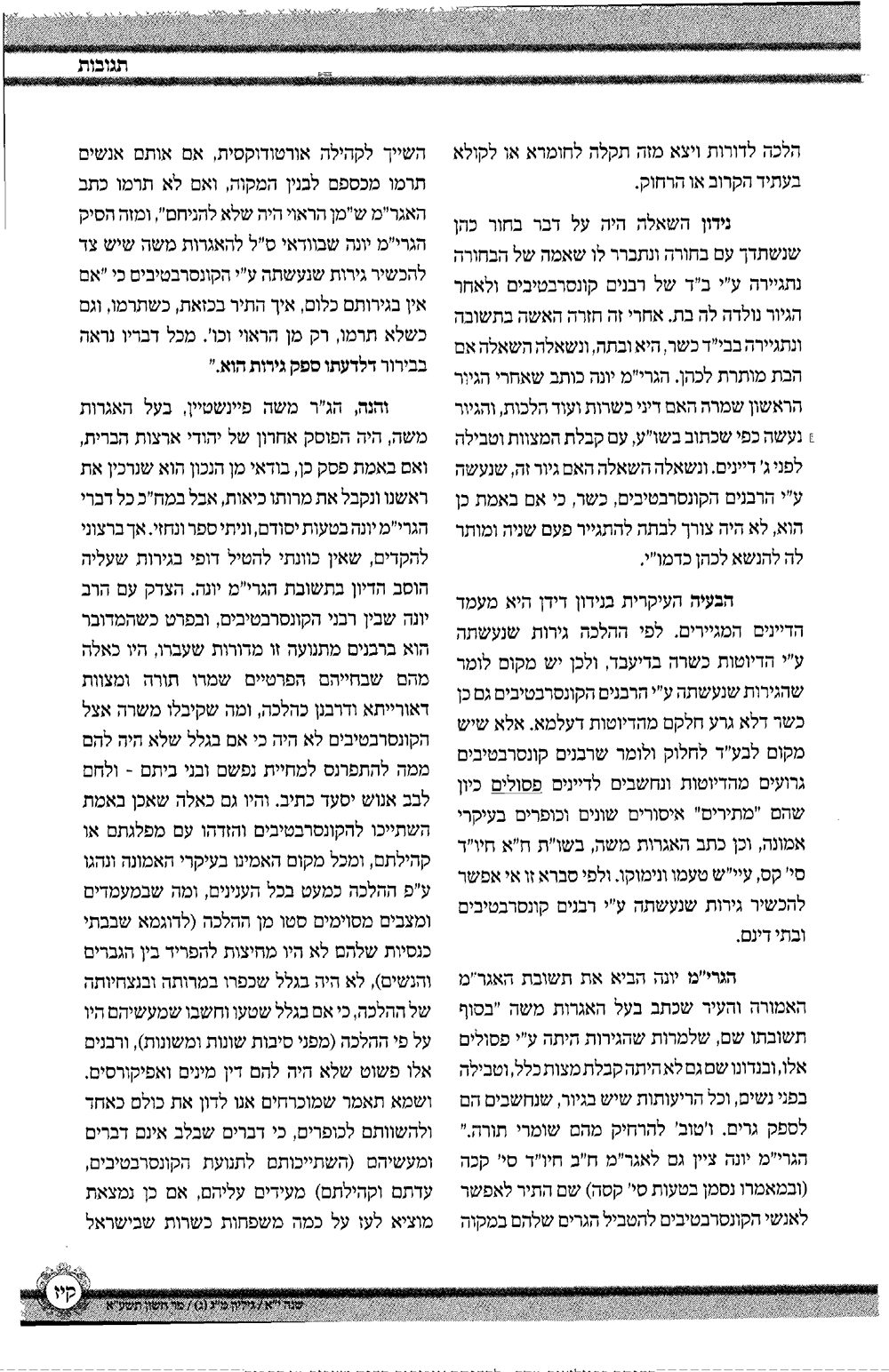 Apropos of the above-mentioned responsum on conversion by R. Ovadiah Yosef, in Beit Hillel, Adar 5770, R. Yisrael Meir Yonah deals with a conversion done by a Conservative beit din. He rules that in this particular case the conversion is valid. This ruling was affirmed by R. Ovadiah.In his responsum, R. Yonah states that R. Moses Feinstein regarded Conservative conversions as doubtful conversions rather than completely invalid, and brought two supposed proofs for this. I responded to R. Yonah in Beit Hillel 43 (Heshvan 5770), and you can see my letter here.[1]