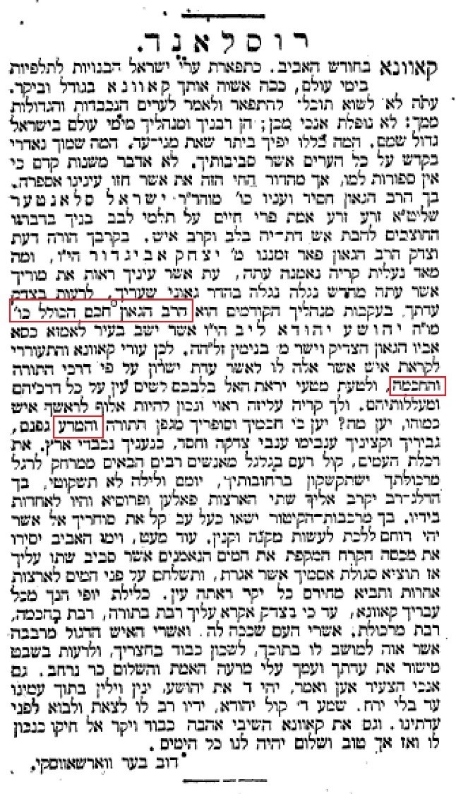 קאוונא בחודש האביב. כתפארת ערי ישראל הבנויות לתלפיות בימי עולם, ככה אשוה אותך קאוונא בגודל וביקר. עתה לא לשוא תוכלי להתפאר ולאמר לערים הנכבדות והגדולות ממך: לא נופלת אנכי מכן; הן רבניך ומנהליך מימי עולם בישראל גדול שם. המה כללו יפיך ביתר שאת מני-עד. המה שמוך נאדרי בקדש על כל הערים אשר סביבותיך. לא אדבר משנות קדם כי אין ספורות למו, אך מהדור החי הזה את אשר חזו עינינו אספרה. בך הרב הגאון חסיד ועניו כו’ מוהר”ר ישראל סלאנטער שליט”א זרע זרע אמת פרי חיים על תלמי לבב בניך בדבריו החוצבים להבת אש דת-יה בלב וקרב איש. בקרבך הורה דעת וצדק הרב הגאון פאר זמננו מ’ יצחק אביגדור הי”ו, ומה מאד נעלית קריה נאמנה עתה, עת אשר עיניך ראות את מוריך אשר עתה מחדש נגלה נגלה בהדר גאוני שעריך, לרעות בצדק עדתך בעקבות מנהליך הקודמים הוא הרב הגאון חכם הכולל כו’ מו”ה יהושע יהודא ליב הי”ו אשר ישב בעיר לאמזא כסא אביו הגאון הצדיק וישר מ’ בנימין זלה”ה. לכן עורי קאוונא והתעוררי לקראת איש אשר אלה לו לאשר עדת ישרון על פי דרכי התורה והחכמה. ולטעת מטעי יראת האל לבבבם לשים עין על כל דרכיהם ומעללותיהם. ולכן קריה עליזה ראוי ונכון להיות אלוף לראשך איש כמוהו. יען מה? יען כי חכמיך וסופריך מגפן התורה והמדע גפנם, גביריך וקצינך ענבימו ענבי צדקה וחסד… דוב בער ווארשאווסקי[15]