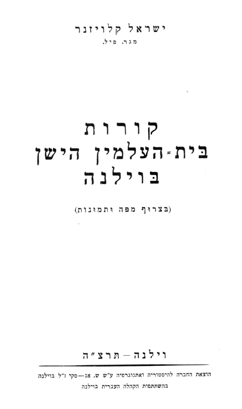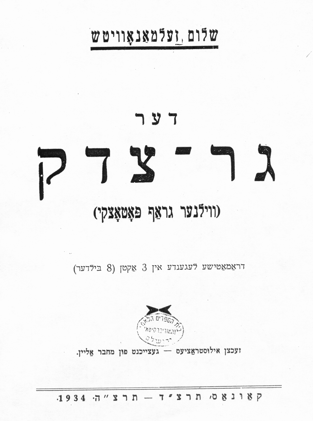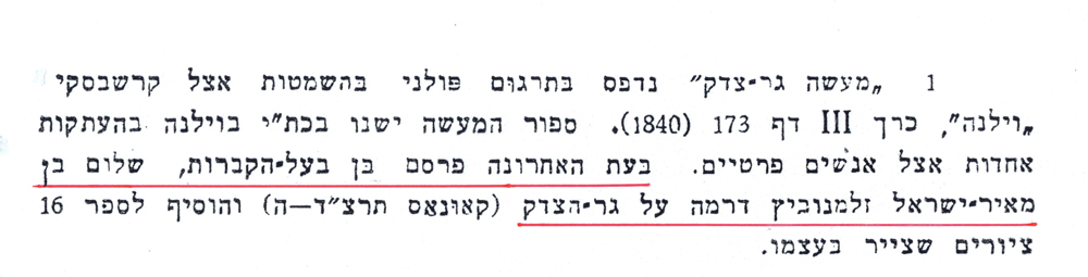 In the summer of 1935, the municipal authorities of Vilna, then under Polish rule, announced their plan to demolish Vilna’s old Jewish cemetery and replace it with a soccer stadium. Vilna – and worldwide – Jewry did not stand idly by. Instead, they engaged in an extensive, and ultimately successful, battle against the municipal authorities. As part of its efforts to win over the municipal authorities, the Vilna Jewish community charged a young Jewish scholar, Israel Klausner,[7] with writing a history of the old Jewish cemetery. It would offer clear documentation and prove beyond doubt that various Polish kings and municipal authorities throughout the centuries had authorized the Jewish community to construct the cemetery and maintain it. The cemetery was legally the property of Vilna’s Jewish community. Klausner’s monograph, entitled קורות בית-העלמין הישן בוילנה (Vilna, 1935), includes a discussion of the Ger Zedek’s grave. In a footnote,[8] Klausner mentions in passing Sholom Zelmanovich’s “recently published drama on the Ger Zedek,” and adds that Zelmanovich was the son of the caretaker of the old Jewish cemetery (Hebrew: בן בעלהקברות ), Meir Yisrael Zelmanovich! The plot thickens.