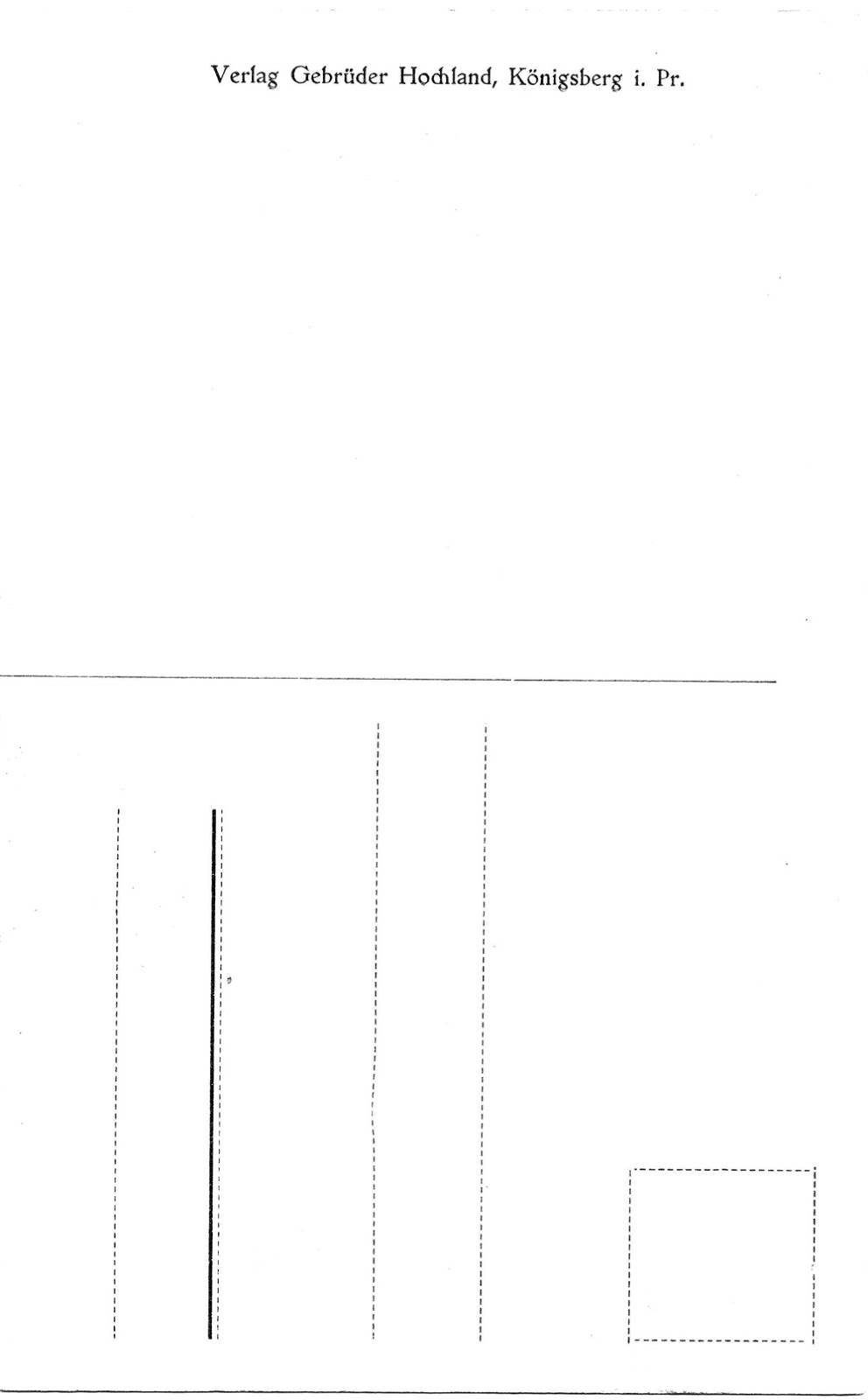 Reverse. The reverse prints the name of the publishing company that produced the postcard: “The Brothers Hochland in Koenigsberg, Prussia.”