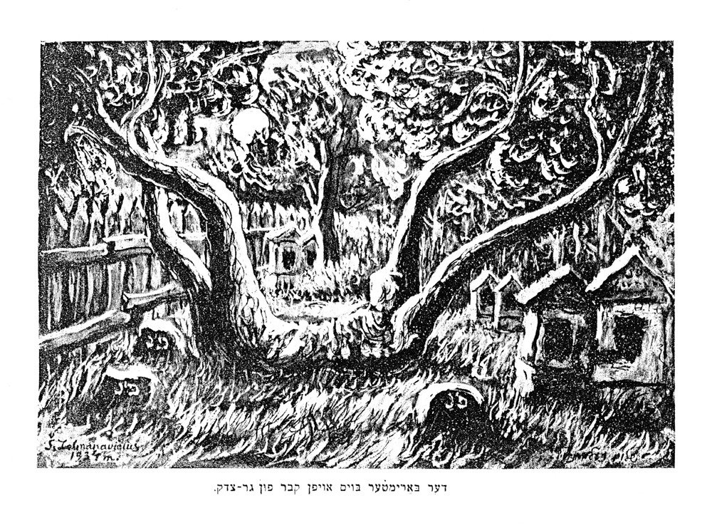This three-act play commemorates the life and death of the legendary Ger Zedek of Vilna in a new and mystical mode.[5] The volume includes sixteen original drawings by Zelmanovich. Several of the drawings preserve details of Vilna’s old Jewish cemetery with seemingly incredible accuracy. Thus, for example, Zelmanovich depicts the northern entrance gate to the old Jewish cemetery, as well as the nearby Jewish caretaker’s house on the cemetery grounds, even though few photographs are extant that even begin to capture the details of those sites. His depiction of the Ger Zedek’s grave (and the human-like tree that hovered over it) is perfectly located in the south-eastern corner of the old Jewish cemetery, and is surrounded by the wooden fence that existed in that corner prior to 1926. Only someone who spent quality time in Vilna’s old Jewish cemetery could have known exactly where to place the entrance gate, the caretaker’s house, and the Ger Zedek’s grave.