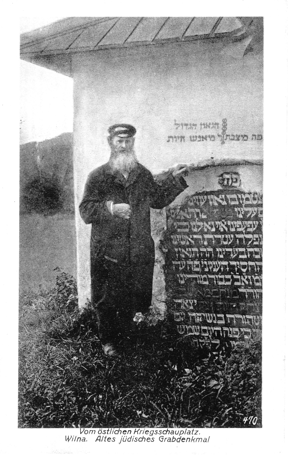 On the picture postcard from 1916-1917, one sees an elderly Jew. One possibility is that it depicts none other than Meir Zelmanovitch, the Cemetery Keeper of the old Jewish cemetery until his death in 1920 at age 70. I suspected that this was the case, but could not prove it until recently — when a small miracle occurred.