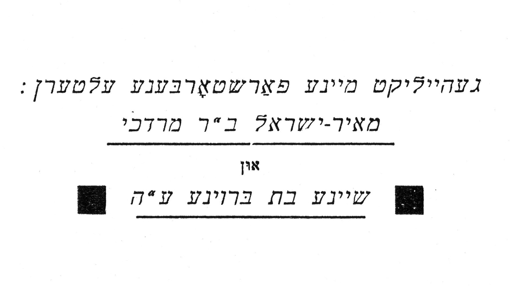 One other matter needs to be noticed. Zelmanovich dedicated the volume in memory of his deceased parents, Meir Yisrael son of Mordechai and Sheyne daughter of Broyne.[6]