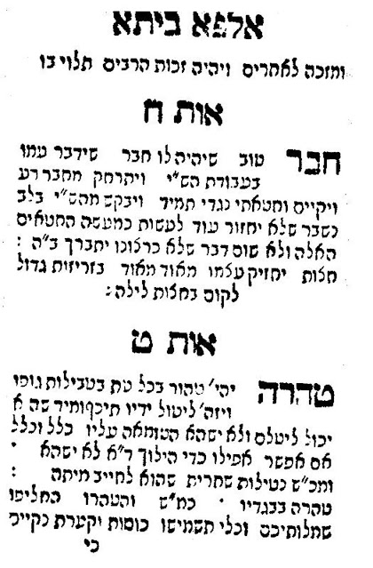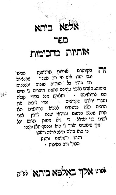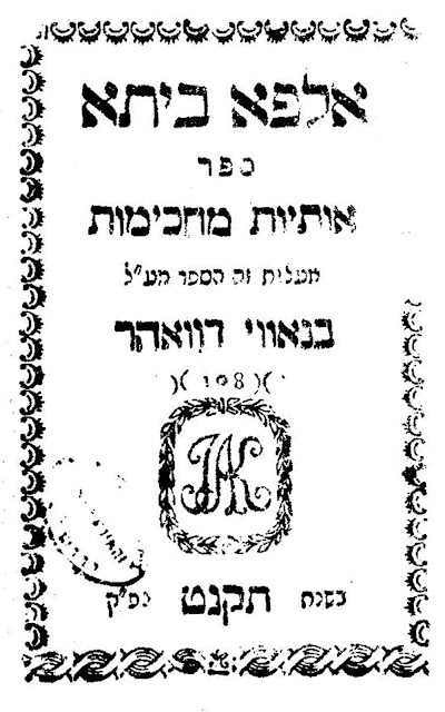 Among the earliest printings of Alpha Beta is the c. 1794/1800 edition, published in octavo (80: [12] ff.) format. The title-page of that edition does not record the date or the place of printing, thus accounting for the dating variances in the bibliographic records. The Library of Agudas Chassidei Chabad Ohel Yosef Yitzhak records it as a 1794 imprint and the press as Zolkiew. In contrast the National Library of Israel records the same edition as c. 1800, place of publication Poland. The title-pages states that it is,