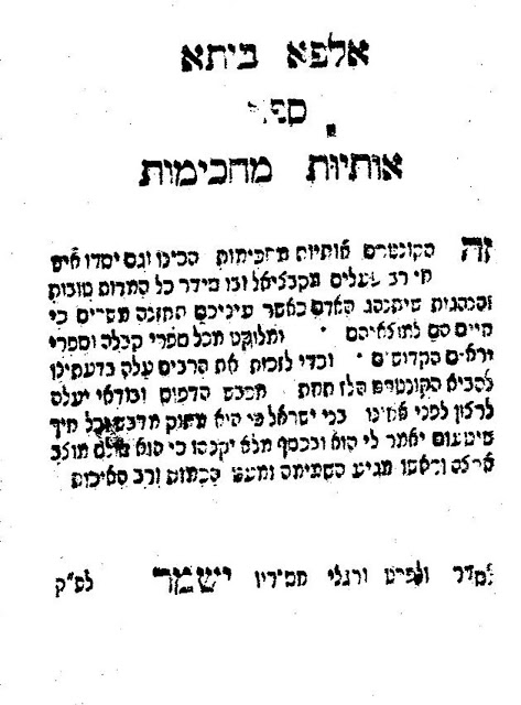 There is yet another edition late eighteenth-century edition (below) this with the location unknown but clearly dated “He guards the steps of His devout ones ורעלי חסידיו ישמר (550 = 1790)” (Samuel 2:9). If the date is correct this would be the earliest of our printings of Alpha Beta. It was noted above that the Thesaurus records a 1790 Russia-Poland edition, likely referring to this printing, presumably the first printing, prior to the Nowy Dwor edition, which may have been the second edition and the first complete printing of Alpha Beta, excepting the recorded Breznitz Alpha Beta (1796), which was not seen. However, this 1790 Alpha Beta mentions Otiyyot Mahkimot but otherwise makes no reference to earlier printings.
