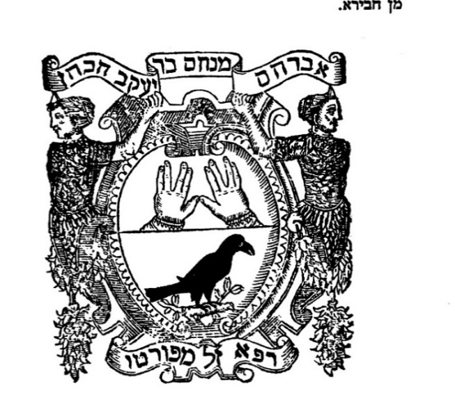 Below the afterward is Abraham Menahem’s escutcheon, consisting of two scantily clad women at the sides holding a streamer that says “Abraham Menahem ben Jacob ha-Kohen.” Between the women is a shield and within it two spread hands giving the priestly benediction, below that a black raven on a branch, and at the bottom another streamer that says “Rapa me-Porto.”[27] In the reprint of the Minhah Belulah (B’nei Brak,1989) the women are more modestly covered.