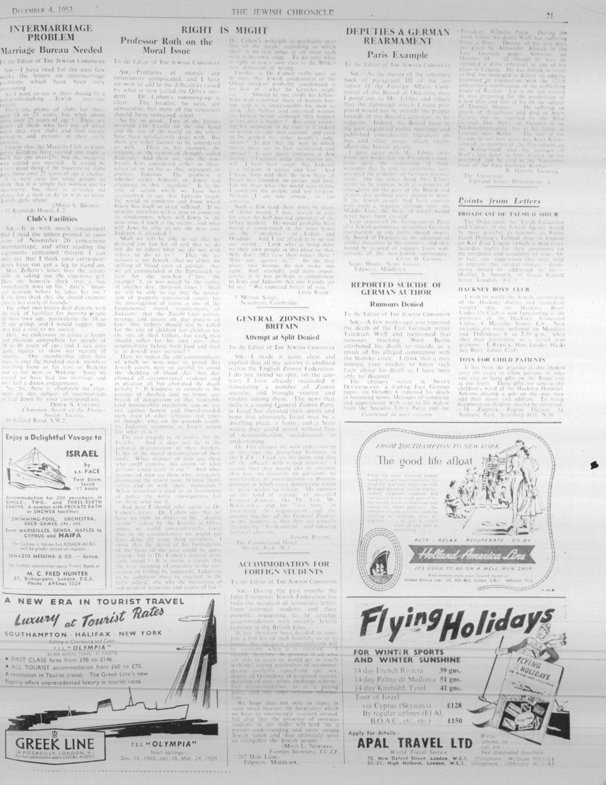In his first intervention (“Israel Border Conflict – The Deputies’ Statement, 23 October 1953), Bentwich repudiated an apologetic statement issued by the Board of Deputies in response to the Foreign Office’s censure of Israel, and he criticized the Qibyā action as “a shocking indefensible act which violates the fundamental ethic of Judaism.” In his second intervention (“Professor Bentwich’s Reply,” 27 November 1953), he responded directly to Rabbi Abraham Cohen, President of the Board of Deputies. He rejected his claim (20 November 1953) that condemnation of the reprisal raid was permissible only for those who could swear they themselves would not retaliate in a similar situation, and he insisted that he himself would oppose the Qibyā action “in any circumstances.” Roth’s December 4 letter continued Bentwich’s criticism of Cohen’s opinion that although the Qibyā action was morally wrong, Jews should not hasten to condemn it. ↑