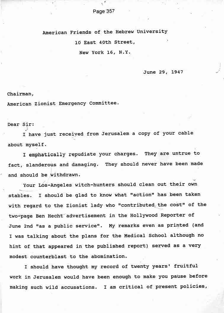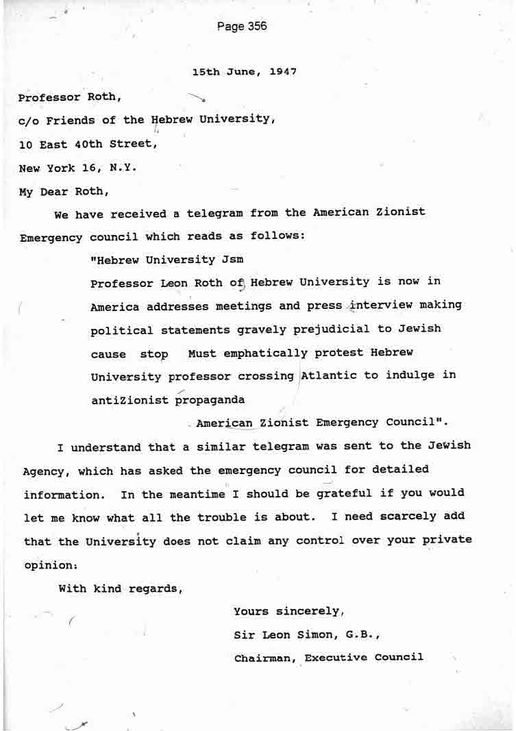 Nearly three decades ago, my student Rabbi Dr. Jan Katzew documented the controversy that erupted in 1947 around Leon Roth’s public opposition to the proposed partition of Palestine. While on a visit to the United States on behalf of the Hebrew University of Jerusalem, Roth was quoted in “Professor Gives Some Opinions on Palestine,” Los Angeles Times (3 June 1947): 4, arguing that partition was impracticable and warning that it would leave “two sore spots that will eventually lead to violence.” His remarks, made less than six months before the United Nations vote on partition, provoked heated reactions from American Zionist leaders, who accused him of anti-Zionist agitation. In a letter of protest, Sir Leon (Arie) Simon, then Chair of the University’s Executive Council and later its President, cited a telegram from the American Zionist Emergency Council charging that “Professor Leon Roth of Hebrew University is now in America … making political statements gravely prejudicial to the Jewish cause.” Roth rejected the accusation as “untrue to fact, slanderous and damaging,” insisting on his right, “after twenty years’ fruitful work in Jerusalem,” to criticize prevailing policies. See Jan Katzew, “Leon Roth – His Life and Thought: The Place of Ethics in Jewish Education” (PhD dissertation, Hebrew University of Jerusalem, 1997), 72-74; the full exchange between Roth and Simon is reproduced below in Appendix 2 (from Katzew’s appendix, pp. 355-358). ↑