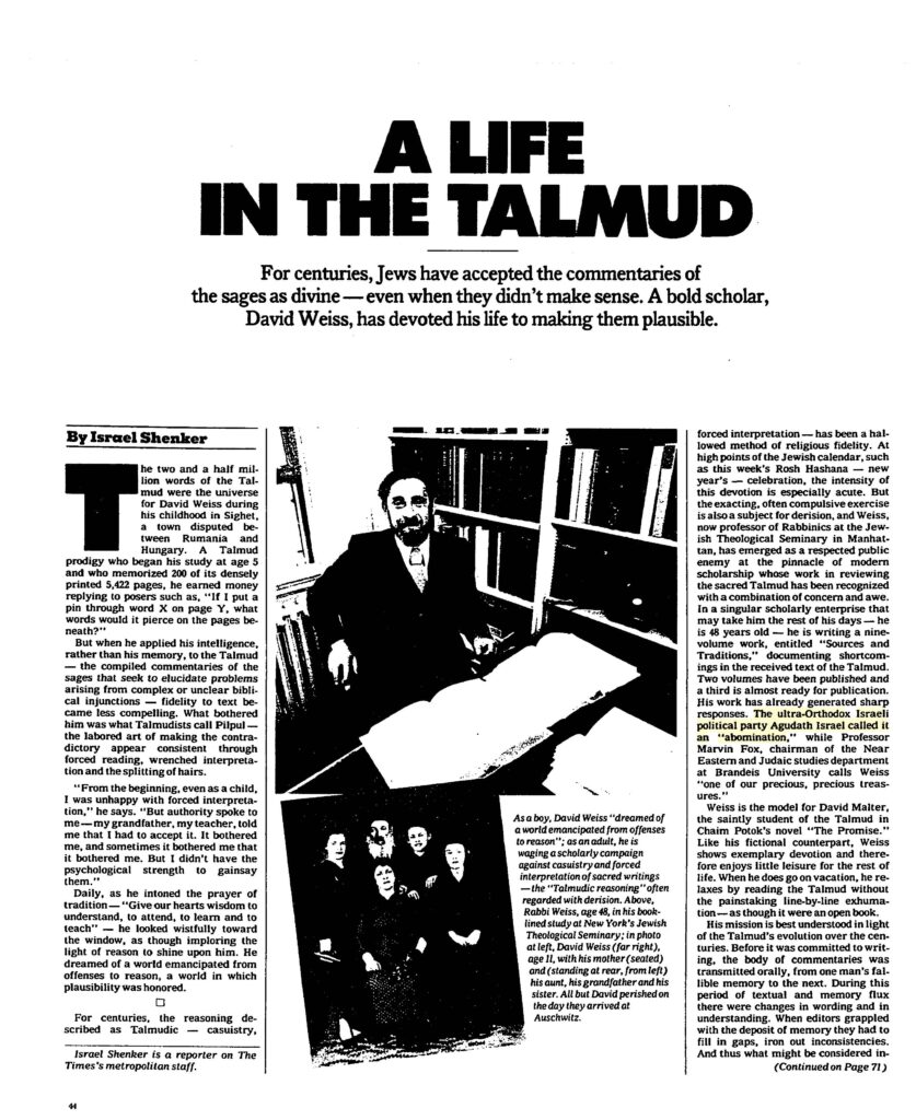 Such sustained engagement with technical Talmudic scholarship is unusual for The New York Times. Yet this was not the paper’s first encounter with Halivni’s work. On the eve of Rosh Hashanah in 1977, The New York Times Magazine published a lengthy profile of Halivni by Israel Shenker under the title “A Life in the Talmud.”[9] There, Shenker described Halivni as “a respected public enemy at the pinnacle of modern scholarship” and reported that “The ultra-Orthodox Israeli political party Agudath Israel called it an ‘abomination,’” citing an editorial in Beys Yaakov Journal. The juxtaposition of scholarly daring and religious denunciation supplied the dramatic architecture that the 2022 obituary would later reprise.