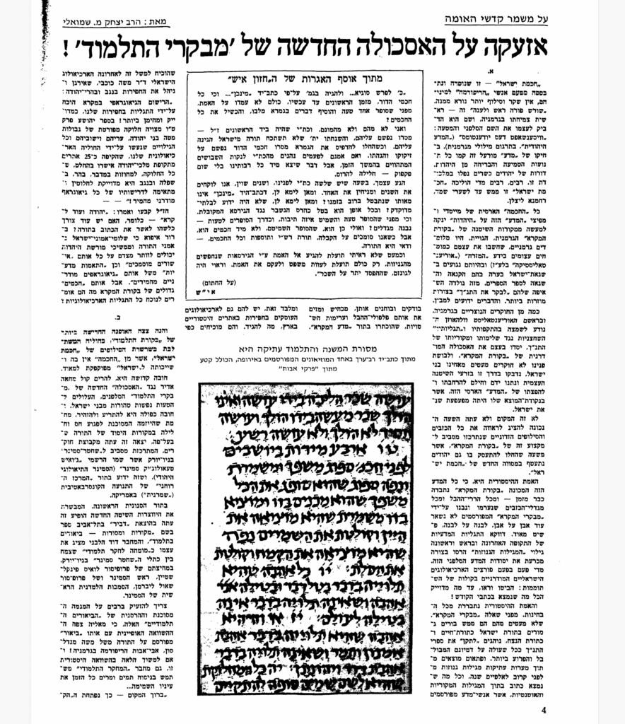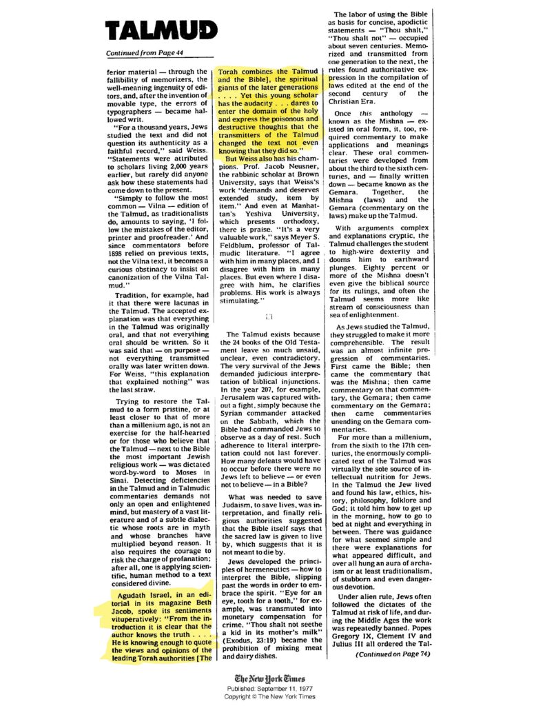 Shenker’s first sustained engagement with talmudic scholarship came in 1971, with a profile of Rabbi Adin Steinsaltz,[42] then deeply immersed in producing a new edition of the Talmud.[43] The article was largely respectful, yet it included a pointed dismissal attributed to Rabbi Louis Finkelstein, chancellor of the Jewish Theological Seminary, belittling Steinsaltz’s achievement.[44] The move is revealing. Even where admiration was warranted, Shenker could not resist inserting institutional tension, foregrounding controversy where extended methodological explanation might have sufficed.