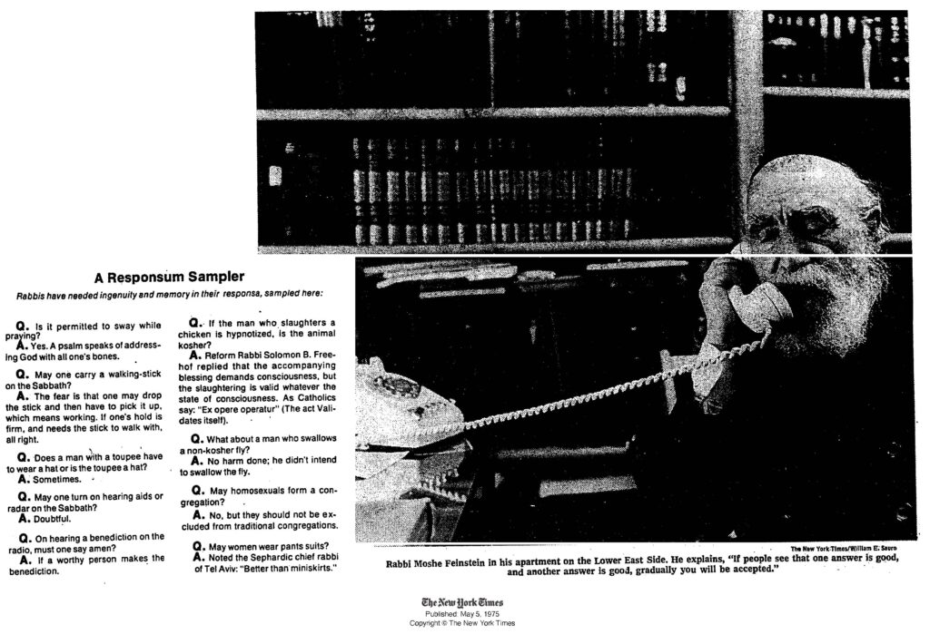 That instinct became even more pronounced in Shenker’s 1975 feature, “Responsa: The Law as Seen by Rabbis for 1,000 Years,” based on interviews with Rabbi Moshe and Rabbi Solomon B. Freehof.[45] The pairing itself was astute, recognizing responsa as a transdenominational genre spanning Orthodox and Reform authority. Yet the article in The New York Times was framed by a prominent callout box – “A Responsum Sampler” – that juxtaposed grave contemporary questions, such as homosexuality and women wearing pants, with deliberately quirky cases,[46] including ritual slaughter under hypnosis[47] and a woman who swallowed a fly.[48] Responsa appeared less as a discipline of burdened responsibility than as a theater of ingenuity and oddity. The irony is that Rabbi Feinstein explicitly rejected such a portrayal. “You can’t wake up in the morning and decide you’re an expert on answers,” he insisted, stressing that authority emerges only through long recognition of sound judgment. More pointedly, he framed pesak as religious accountability: “A rabbi who replies to people’s questions works harder than a doctor dealing with a case of life and death. The doctor is responsible only to his patient, but the rabbi is responsible to God.” This ethic of burdened responsibility, articulated in the interview itself, stands in tension with the broader journalistic framing. Rabbi Feinstein articulated the same conception programmatically in the introduction to the first volume of Iggerot Moshe,[49] where he repeatedly describes his rulings not as demonstrations of mastery but as obligations imposed by circumstance. His responsa, he writes, emerge from “darkness,” composed only because he felt compelled to give instruction; the decisor must rule according to “what his eyes see and what appears true to him,” even amid doubt and fear of error. Authority, in this account, lies not in brilliance or certainty but in the willingness to assume responsibility for guidance. This was an ethic that closely parallels his insistence in the Times interview that “the rabbi is responsible to God,” not to ingenuity or acclaim. [50]