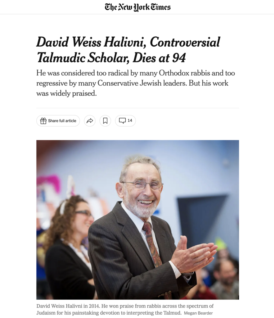 Rabbi Professor David Weiss Halivni passed away on June 28, 2022. On July 17, the New York Times published a lengthy obituary under the headline and subheadline: