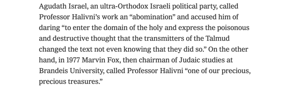 The framing is revealing. Halivni is positioned between two opposing camps, too radical for one and too regressive for the other. This symmetrical construction reduces a complex methodological dispute to a narrative of ideological extremity and obscures the substantive nature of Orthodox objections. The obituary further characterized Halivni’s scholarship as grounded in the “controversial idea” that the Talmud is “riddled with inconsistencies and incongruities” resulting from the vulnerabilities of largely oral transmission, “subject to the flaws resulting from fallible memories.” It reproduced Agudath Israel’s denunciation of his work as an “abomination,” accusing him of daring “to enter the domain of the holy” and to suggest that the transmitters of the Talmud altered the text unknowingly. At the same time, Halivni was quoted defending his position: “divine origin does not preclude critical study, since critical study seeks to purge the text of human error.”